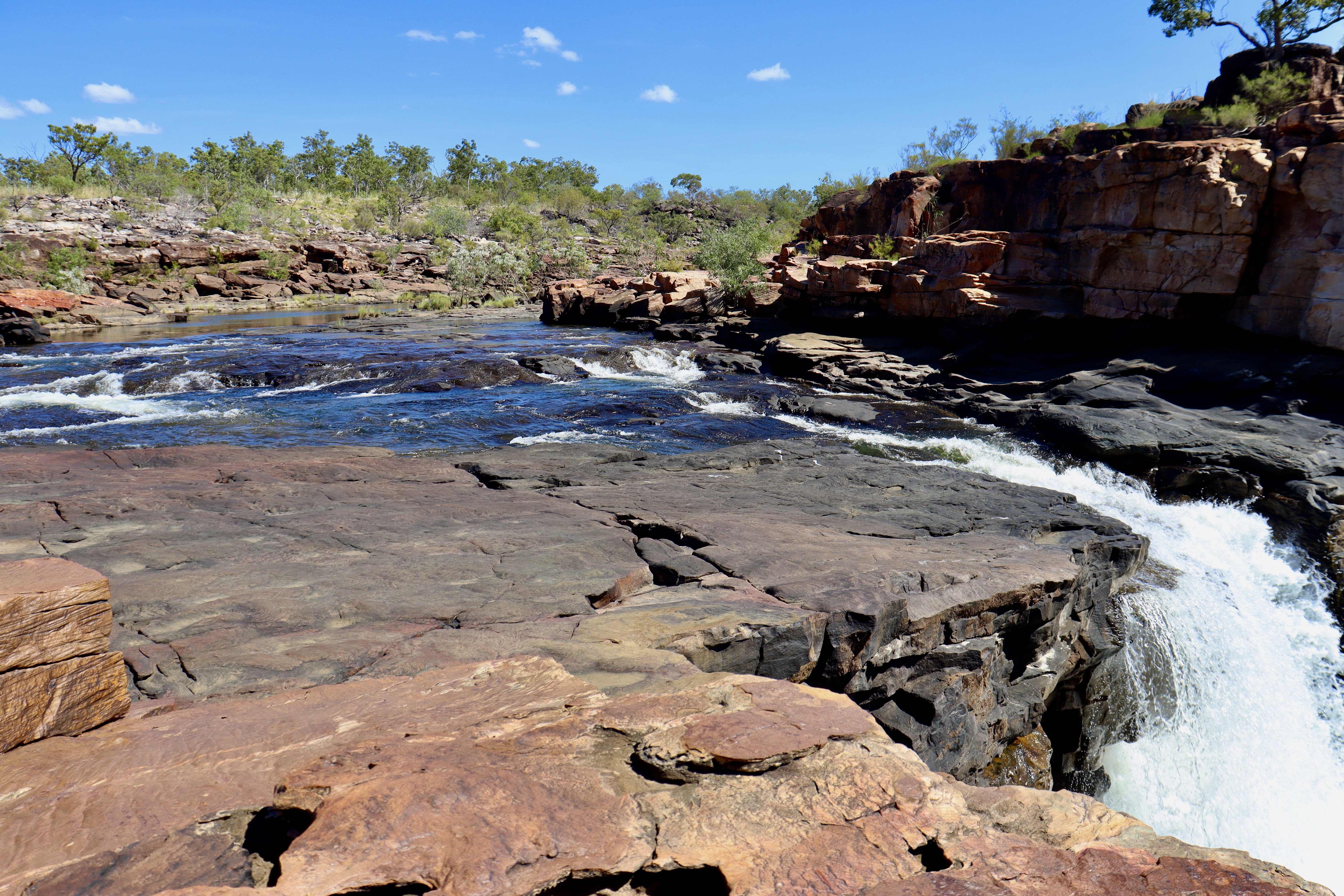 After the respite of the falls, we made our way back to the track and re-commenced the journey to Mitchell Falls/Punami-Uunpuu. The next water crossing was at the top of Big Mertens Falls. It was certainly a much larger event than the previous waterfall and there was a substantial drop to pool below. The gorge itself was quite narrow.
